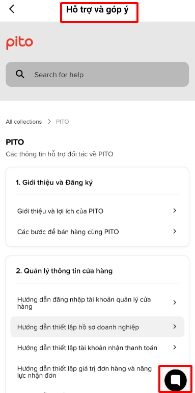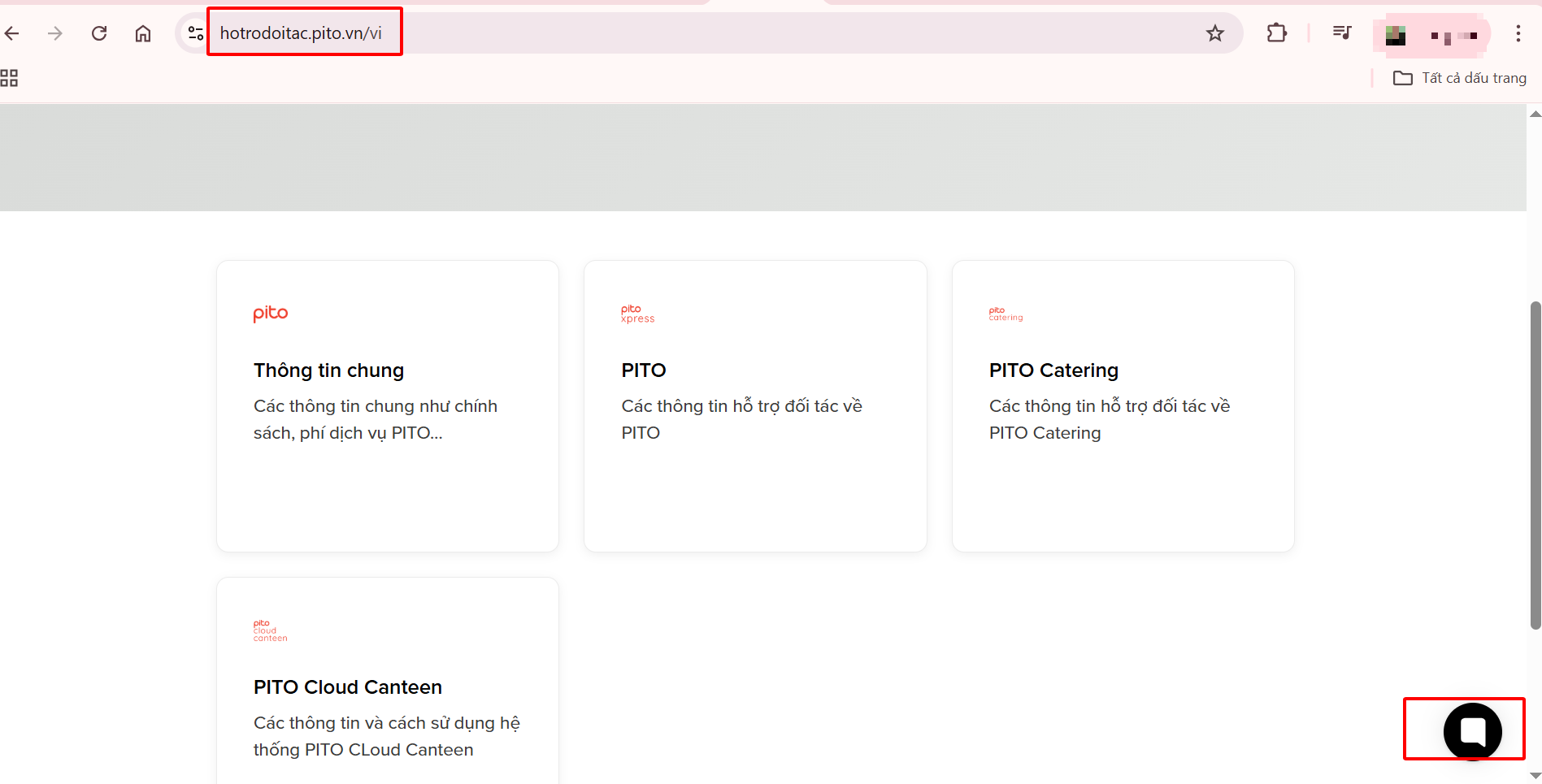 Trong web https://hotrodoitac.pito.vn chọn biểu tượng tin nhắn