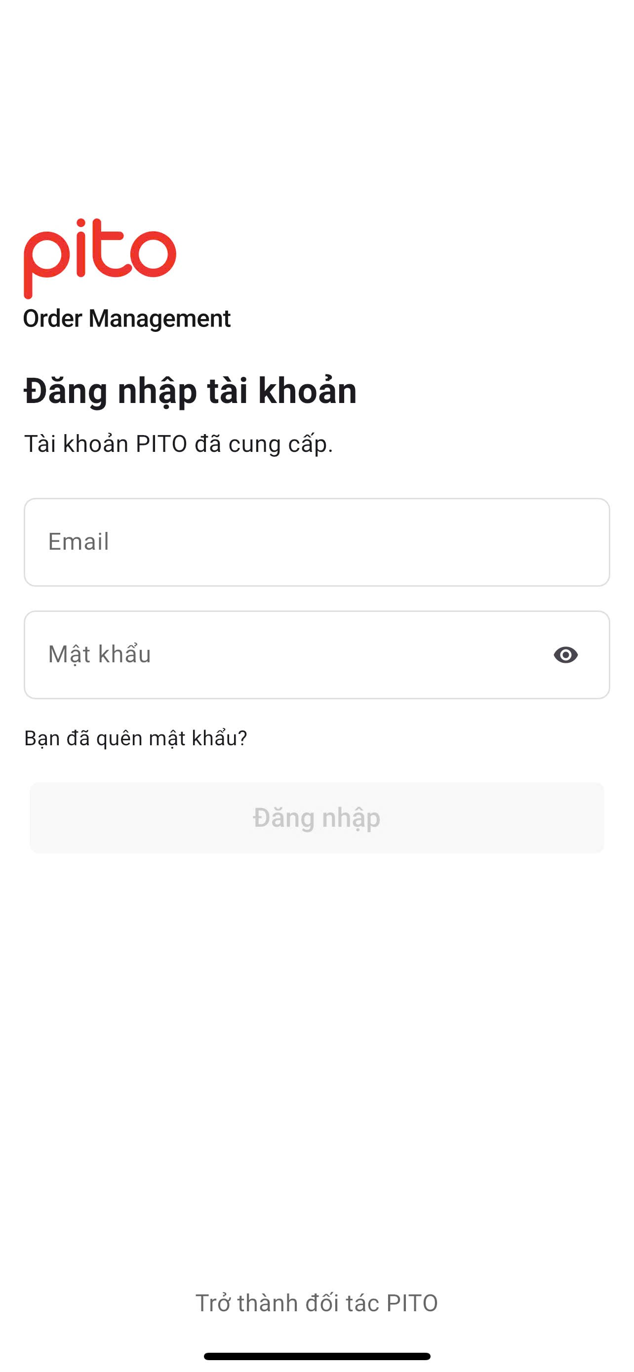 Bước 2: Tại màn hình đăng nhập, nhập email và mật khẩu đã được PITO cung cấp
