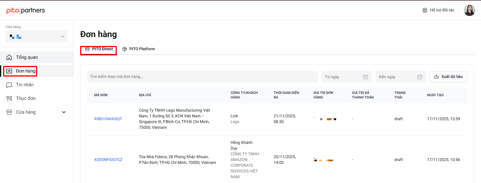 Chọn “PITO Direct” để xem các đơn hàng khách đặt qua tư vấn viên